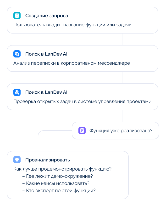 Агенты LanDev AI способны к многошаговому рассуждению: они анализируют контекст, формируют пошаговую стратегию и автономно выполняют сложные задачи — без постоянного вмешательства человека и с учётом ваших бизнес-правил